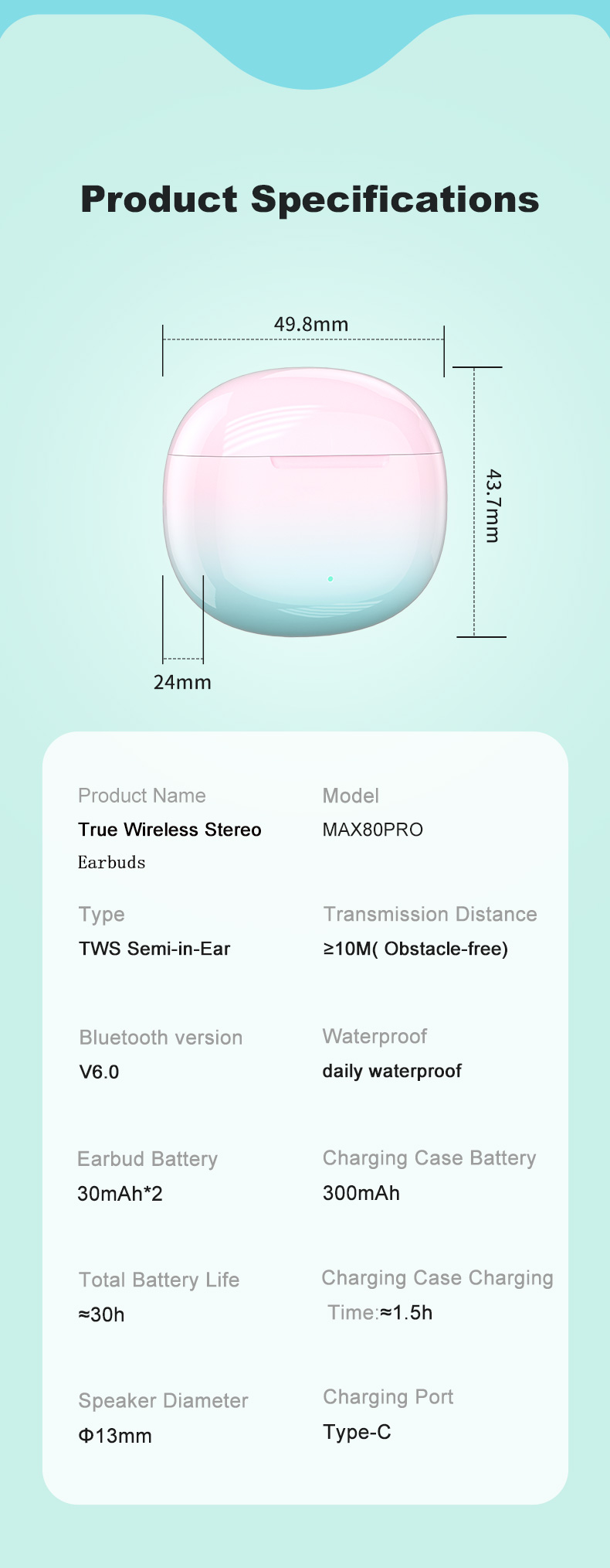 Charging box battery capacity:300mAh